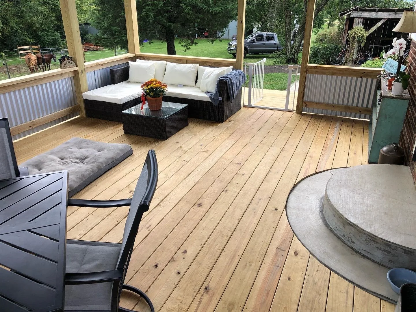 Treated Wood Deck with Corrugated Railing.